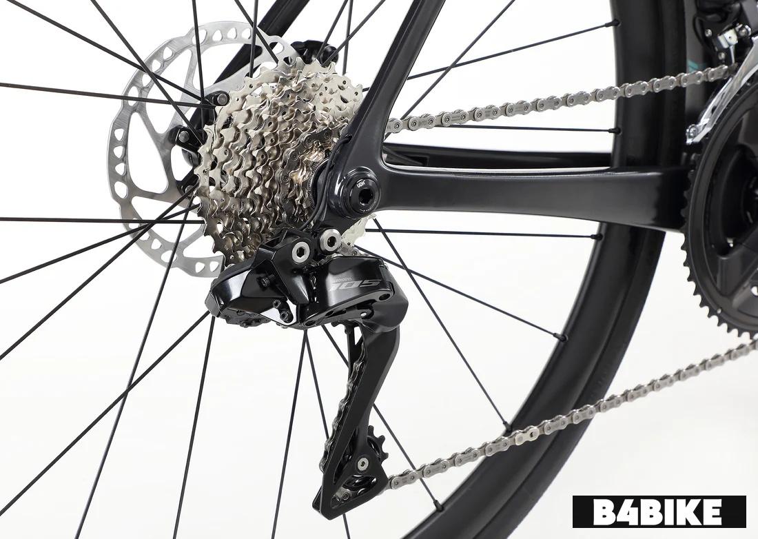 - UCI-certified carbon frame and fork with tapered steerer tube in custom size-specific carbon layups